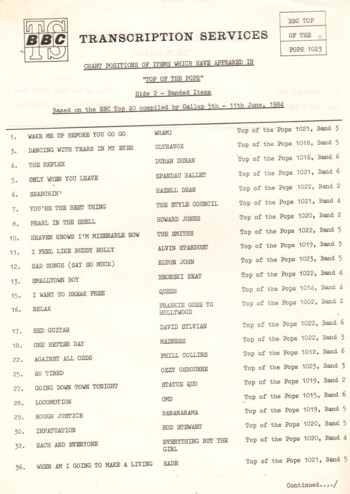 RADIO CUE SHEETS FOR THE SHOW WHICH WAS BOADCAST ON 7TH DEC 1986